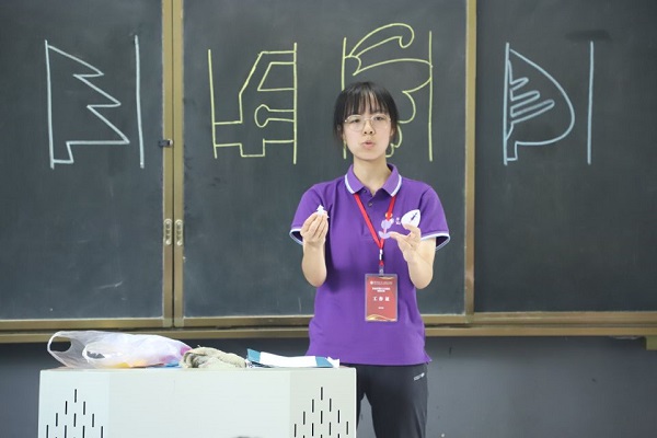 在智育课堂中,实践队队员挑选常见的拓扑学问题、实例,挖掘其中蕴含的数学知识,激发学生们的学习兴趣。通过展示“巧解绳结”、“单走岔路”等生活中的数学问题,数统实践队队员让学生们了解生活中数学拓扑情境,并为小朋友们讲解基础拓扑学知识,帮助理解相关类型问题。讲解过后,数统实践队队员们同小朋友们双手互相绑上彩绳,进行互动游戏“双人解绳”。在游戏过程中,小朋友们主动思考,不断探索尝试,体验以数学思维看待问题,感受实际生活中数学的巧妙应用。