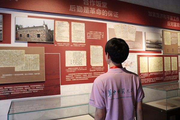 随后,实践队来到了列宁市苏维埃合作饭堂旧址。实践队员们首先注意到了墙上的巨大标语:目前的基本任务是复兴苏区的经济问题。经讲解员讲解,实践队队员们了解到,粮食问题是当时面临最困难的问题,地方主要的劳动力都在前线奋战,导致没有足够的劳动力来发展生产,因此造成苏区的经济状况不容乐观。国民党利用这个情况,通过封锁粮食的手段,企图从内部瓦解红军,鄂豫皖边区面对当时形势调整粮食政策——各机关每日只吃稀饭一次以节约粮食,保障前线战士和老百姓的需求。实践队队员束智磊仔细阅读了鄂豫皖中央分局在当年下达的临时通知,感慨道:“革命先烈们尽力刻苦自己,节省粮食,以保证在前线奋战的将士们和老百姓的需求,不禁让我肃然起敬。正是革命先辈们牺牲自我、顾全大局、以人民为中心的奉献精神,才让我们一次次战胜了不可能,赢得了四万万民众的心。我们要始终坚持鄂豫皖革命先辈‘以人民为中心’的发展理念,在习近平新时代中国特色社会主义思想的指导下,不忘初心,牢记使命,在新时期作出新贡献。”