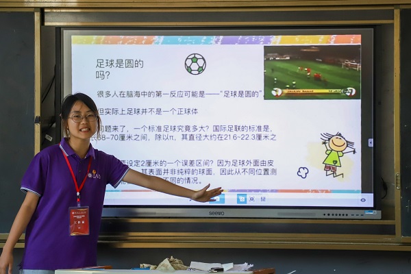 为鼓励乡村儿童假期加强锻炼,增强体质,数统实践队队员设计了三节体育相关课程,同时在体育中融入数学知识,实现学科间融会贯通。第一堂课以“妙解数与体”为主题,以体育中蕴含的数学知识为切入点,挖掘生活中的数学知识。数统实践队队员通过视频、PPT、真人展示等多种方式,为学生们讲解篮球、足球、跑步等运动项目中的数学知识,并且组织学生们亲身实践,进一步感受体育活动中数学的魅力。