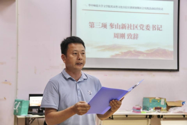 华大青年讯(通讯员 伍倩 周旺章)7月17日下午,2022年华中师范大学文学院光未然文化自信宣讲团(以下简称“宣讲团”)暑期社会实践活动结营仪式暨文艺汇演在白鹤泉青少年空间举行。蔡甸区奓山新社区党支部书记周刚、华中师范大学文学院团委书记李哲立出席本次活动。
