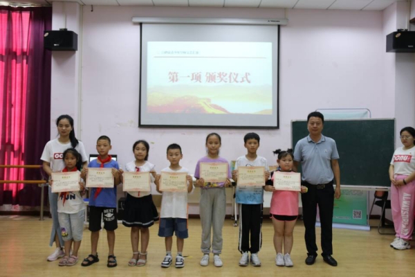 齐唱国歌后,全体少先队员开展队日活动,重温入队誓词和队歌,在庄严的仪式氛围中树立为共产主义事业贡献力量的坚定信念。随后,奓山新社区党支部书记周刚上台致辞。周刚在致辞中对参与青少年空间暑期托管项目的志愿者老师和工作人员表达了感谢,并对宣讲团的成员们提出了“争做时代新人”的殷切希望。邹秦丹则在发言中总结了宣讲团在这一周内开展的特色课程和志愿服务活动,并对青少年空间的孩子们送上了祝福,希望他们度过一个充实而有意义的假期。在掌声中,周刚与李哲立共同为优秀学员颁奖。