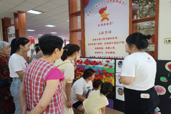 仪式正式开始前,宣讲团白鹤泉分队队长邹秦丹带领各位领导、老师和家长观赏了白鹤泉青少年空间的小朋友们制作的文化展板。踏浪红船、京剧脸谱、稻浪图……一幅幅展板不仅体现了小朋友们的动手能力,也展现了他们积极向上的精神面貌。