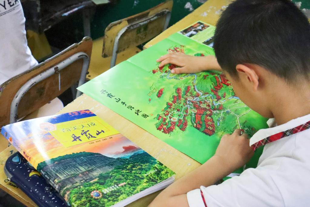 在科普书籍的研读探讨环节,学生分组阅读《奇美天成丹霞山》,以书中的图片和丹霞山研学旅行地图为介质,感受丹霞地貌的独特魅力。其间,学生对红色的厚层砂砾岩和粗细相间的沉积层理发出赞叹,并以组为单位,进行了阅览分享。柳向婷鼓励同学们对身边的自然景观和书中的丹霞地貌进行对比和思考,进一步挖掘和体会祖国河山的壮丽与美好。