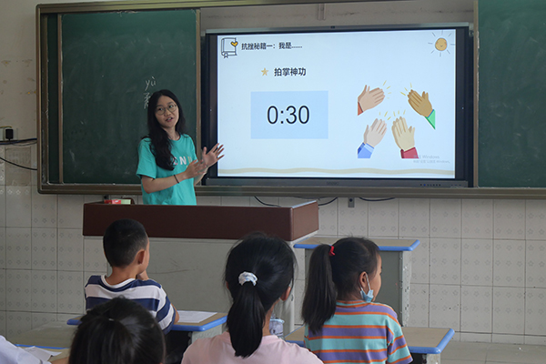心理健康是指心理的各个方面及活动过程处于一种良好或正常的状态。为增强学生心理调适能力,促进学生形成诚实守信、自尊自律、乐观向上等良好品质,服务队成员刘琪、郭怡玲结合心理学专业知识,用具有趣味性的游戏引导学生了解应对挫折和集中注意力的方法,教授学生如何控制情绪。该系列课程聚焦学生的心理健康,以“活动+讲授”的模式,让学生在学习知识的同时放松身心。