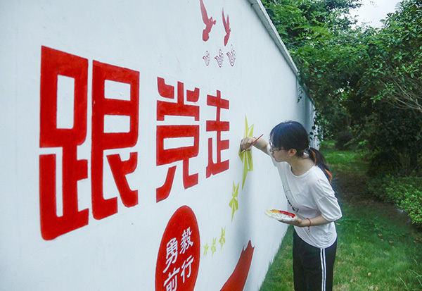 为了更好确定文化墙的设计结构和具体内容,7月7日到达宝塔山村后,宝塔山村党支部副书记、副主任刘欢带领实践队对整个宝塔山村进行了参观。她表示,希望能够借此机会在宝塔山中进行红色文化的教育与宣传,而此次为实践队安排的文化墙绘制地点在柳山湖镇宝塔山村村委会两侧。参观过后,文化墙组组长吴枫霖表示,此次绘制任务较重,共计十三面小墙,一面大墙。她说道:“任务重虽然给文化墙组带来了压力,但这更是我们的动力,是鞭策我们加快脚步的源泉。”