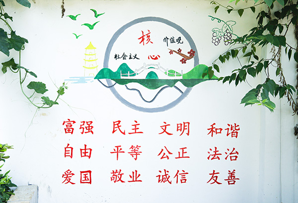 宝塔山村因龙坑宝塔而得名,荷花接天,而所属地柳山湖镇盛产葡萄,文化墙组队成员总结了该村三大元素,分别为“宝塔”、“荷花”、“葡萄”。经过构思与商讨,文化墙组成员决定于社会主义核心价值观封面绘制“宝塔”、“葡萄”元素,而将“荷花”元素融入“友善”板块。