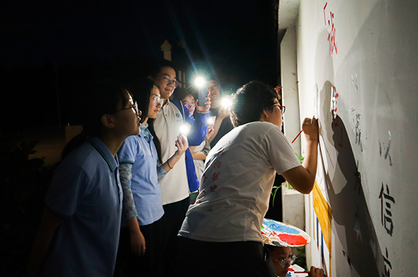 除了工作时的自然条件问题,文化墙组在绘制墙面的过程中还面临着许多困难。由于文化墙组的成员仅有三名,人力资源有限,实践队其余各组队员均会前往文化墙处提供帮助。实践队指导老师姜春勇也参与到文化墙的绘制中。在回忆过往十一天的工作时,吴枫霖表示,每天晚上画墙时,常常会有白天参与“希望家园”暑期班的学生们路过,询问她们是否需要帮助。