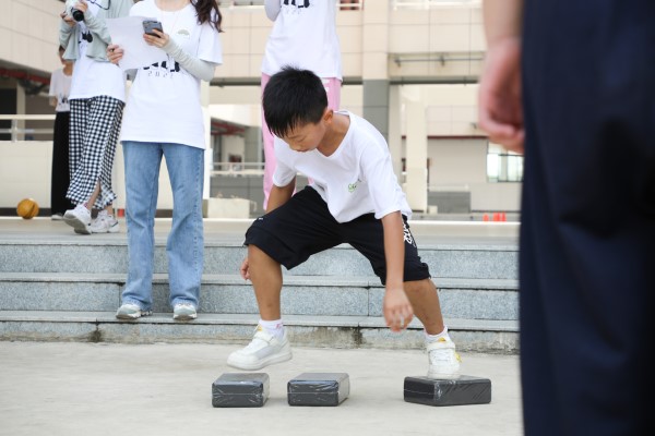 在比赛过程中,团队协作、齐心协力的故事无时不在上演。在“企鹅漫步”比赛中,同学们通过两腋和双腿分别夹紧三个球,并将求运送到赛道的另一端。当球不慎滚落时,同组成员帮助场上队员调整球的位置,并分享比赛经验、指导正确的夹球姿势;而在“摸石头过河”的赛场上,队尾的同学将铺在地上的海绵砖传递到队首,在紧密的配合中,同学们踩着海绵砖一步一步向终点移动。