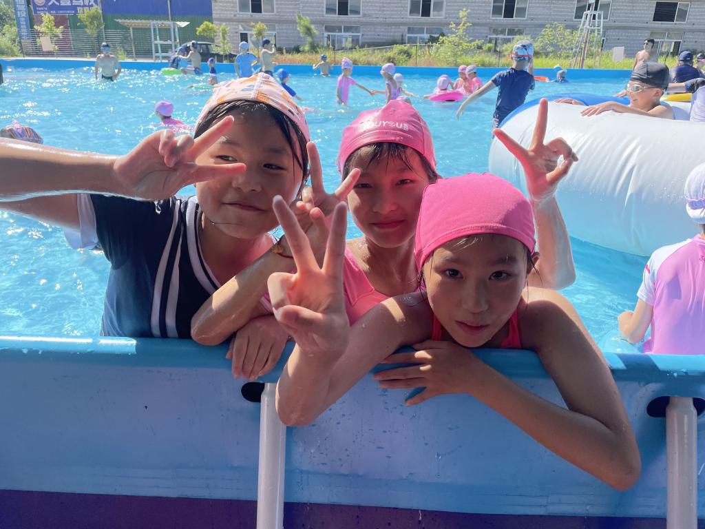 学生们进入泳池,练习着划水、打水、水下呼吸等动作,教练在一旁指导纠正,帮助同学们掌握游泳技能。自由游玩时,同学们相互嬉戏,感受水上滑梯的乐趣。同时,支教队成员在泳池周围看护,保障学生们的安全,让学生快乐地度过下午的游泳时光。