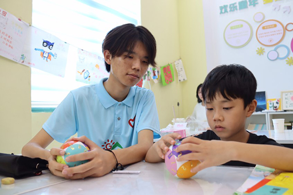 在孩子们初步了解“智慧球”之后,志愿者设立了几个简单的颜色归位目标,让孩子们在合作中进一步提升对颜色认知和手脑协调能力。孩子们在志愿者的指导下又快又好地完成了这一目标,提升了学习信心。