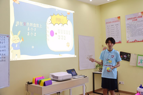 “青马红心”实践团成员项文慧、肖书河、韦昊宇在沿河社区为社区儿童带来了一节别开生面的科学思维课。区别于传统课程,这节科学思维课将数学题目与教具“智慧球”相结合,改变了注重做题的单一学习方式。志愿者教师在布置学习任务后,要求孩子们按小组一起操作来完成目标,并通过比赛形式激发了孩子的学习兴趣和探索欲。