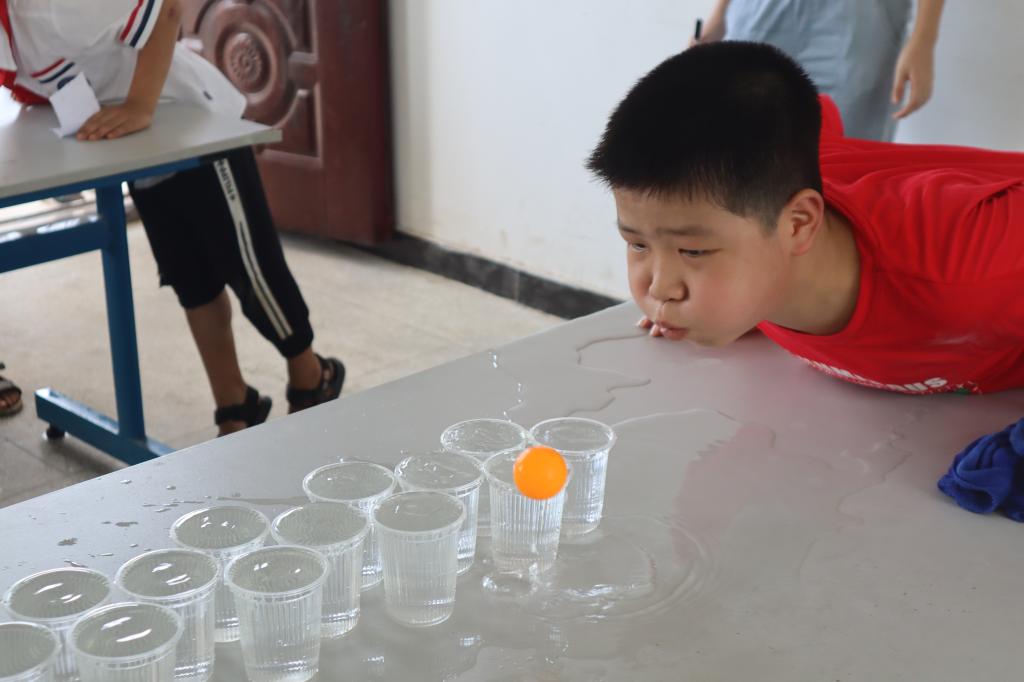 与此同时,个人比赛也正在进行中。水上吹乒乓球是一项考验团体合作和肺活量的趣味运动。十二个装满水的杯子呈一定形状排列,参赛者两人一组,需要合作将乒乓球从第一个杯子吹向最后一个杯子。且比赛期间,乒乓球不能掉到桌子上,否则游戏失败。参赛学生逐个尝试。部分学生找到规律,用嘴集中吹球的下部,完成了比赛。