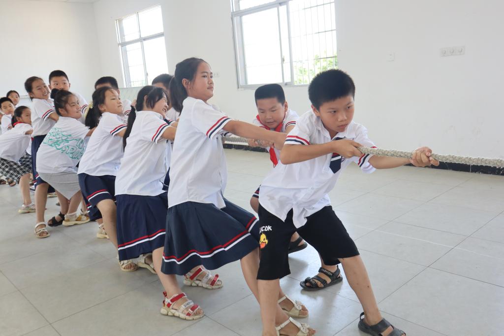 本次趣味运动会由团体赛和个人赛两部分组成。其中,团队赛分为拔河比赛和两人三足接力比赛两个项目,个人赛分为颠运乒乓球、你画我猜、水瓶保龄球、抱团游戏、大象找鼻子和水上吹乒乓球六个项目。拔河比赛由二到五年级共八个班级参加,采取同年级两个班三局两胜的比赛模式。五年级一班的学生在拔河比赛中,依靠爆发力取胜。四年级一班的学生在班级同学的加油声中,通过下蹲使重心下沉,且紧握长绳往后拉,获得胜利。