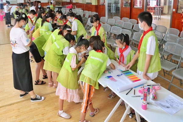 武汉队队长张庆鑫提到:“用作品抒发对家乡、祖国的热爱,可以帮助学生培养留心生活的良好习惯,建立与家乡的情感纽带。在活动中,我们让学生感受家国情怀,向往美好未来,德育、美育并举,为学生扣好人生的第一粒扣子。” 绘画是儿童钟爱的趣味活动,用“同画一幅画”的形式不仅符合活动的趣味性,而且锻炼了学生的协作技巧与沟通能力。本次活动还引导学生用绘画的形式画出眼中的蔡甸,有助于学生加强对家乡的认同感与熟悉度。