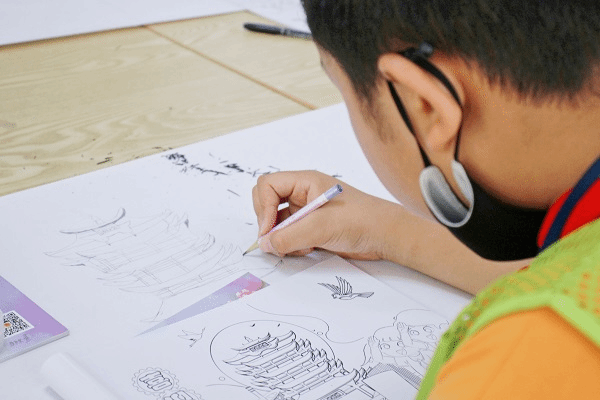 在白鹤泉青少年空间,学生绘画以“衣、食、住、行”为切入点,勾勒家乡常见的事物。龙王庙青少年空间则将主题拆分为“蔡甸·武汉·中国”三个板块,由小至大,让学生将家乡与祖国联系在一起。在90分钟的时间内,两个空间共计70余名学生结合老师列出的素材自由创作,完成了青少年眼中的家国画卷。