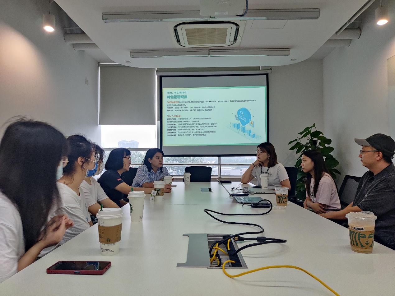 7月27日,研究生实践队一行来到北京奇虎科技有限公司参观并参加座谈会。奇虎360人力资源部刘旭和算法工程师、2021届研究生校友余晓鑫参与座谈会。刘旭首先向研究生实践队介绍了360公司的发展历史和相关业务,并感谢计算机学院对优秀人才的培养,希望加强校企合作。蔡庆昱表示希望继续加强校友联系。她邀请360公司与计算机学院在网络空间安全方面建立校企合作,培养优秀人才,助力我国网络安防事业。