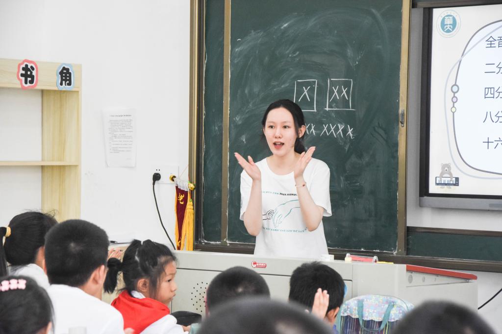 熊瑾以一题字谜引出本课将要学习的歌曲《小星星》。在熊瑾的带领下,学生进行了“星光恰恰恰”小游戏,以鼓掌的方式感受歌曲的节奏,同学们随着音乐节拍鼓掌。熊瑾以学生能够理解的语言对节奏进行讲解教学。最后,熊瑾通过提问“天空中的星星为什么越来越少了”,引导学生从音乐出发,连接现实生活,树立起“爱护大自然,保护大自然”的意识,共同守护浩瀚星空。