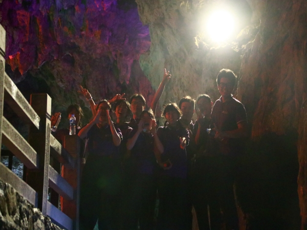 在导游的带领下,数统实践队队员参观了位于"秀才看榜"景点绝壁下的太古洞。导游为队员们介绍了此洞和钟乳石的形成原理。实践队队员们了解到太古洞全长约3000米,有宽敞大厅、曲折廊道、险峻峡谷、幽深地下河以及五彩缤纷的钟乳石、石瀑飞流等景观,是大自然鬼斧神工的艺术宫殿,堪称地下的“世外桃源”。