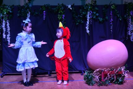 实践队队员们先来到了小班《红公鸡》主题活动相关活动室。《红公鸡》讲述一只公鸡主动承担起孵蛋任务的暖心过程,课程以此故事为中心点,发散出一系列的学习活动,实现了健康、语言、社会、科学、艺术五大领域的有机整合和平衡。