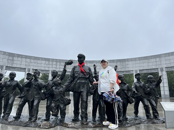 位于辽宁省抚顺市的雷锋纪念馆曾是雷锋生前所在部队驻地,数统实践队队员那诗语前往此地进行参观学习。雷锋纪念碑竖立在纪念馆的主轴线上,上面镌刻着毛泽东主席亲笔题写的“向雷锋同志学习”7个大字,昭示雷锋精神永放光芒。通过讲解员的讲解,那诗语感悟到,雷锋在用他的每一个行动,每一句话告诉我们——平凡才是真正的伟大,默默无私的付出是为了我们的世界变得更加美好。