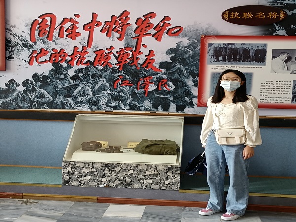 数统实践队队员分别前往云南大理周保中将军纪念馆、湖北安陆赵家棚抗日烈士陵园及辽宁抚顺雷锋纪念馆等地进行参观学习和采访调研。其中,数统实践队队员张秋怡前往了云南省大理市湾桥镇湾桥村,在与纪念馆的工作人员交谈时她了解到,周保中出生在当地的一个贫苦白族农村家庭,在领导东北抗日联军进行艰苦卓绝的14年抗日斗争中,他英勇善战、战功显赫,经历无数场战役,带领抗联将士牵制日本关东军70多万人,歼灭日伪军20多万人,为世界反法西斯战争作出了重大贡献。