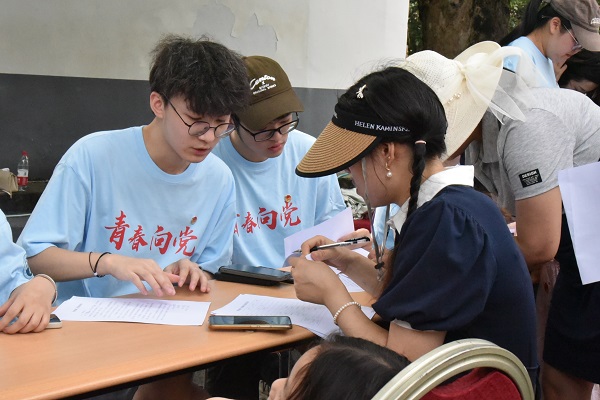 6月28日上午,志愿者们早早来到报名地点。在带队老师王乐的指导下,大家各司其职。搬桌子、摆物资、整理表格……各项环节都有条不紊地开展进行。志愿者们耐心等待家长们的到来。