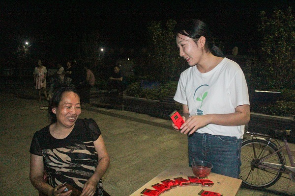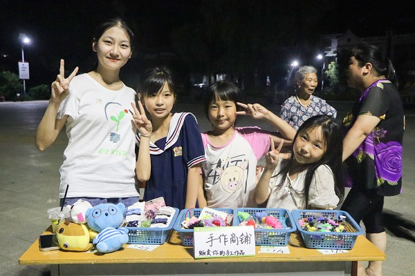 共谋商定主题,共建盘活资源。在当地村委会的帮助下,实践队员们与孩子们共同谋划筹备,成功设立“创作工坊”“手作商摊”“智慧丛林”等五个摊位。同时,结合百丈河村的特色茶叶产业,队员们联合村民另设“百丈茶庄”摊位。在活动现场,百丈河村妇联主任胡星星指出,此次乡村创意集市实现了村两委、大学生团队、村民、学生等多群体的联动,真正做到一呼百应,为构建共建共治共享的乡村治理格局搭建了良好平台。