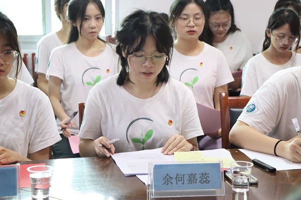 支教组组长余何嘉蕊分享《高校—乡村线上线下互联 农村支教长期效能的建立》提案,阐述线下“引进来”“走出去”和线上建立外语教育资源共享平台的方案;调研组组长车佳佳分享《高校视角下的乡村外语教育发展议案研究》提案,从学生和家长两个方面提出英语教学改进方案,指出要以丰富的教学形式,激发学生对外语学习的兴趣。