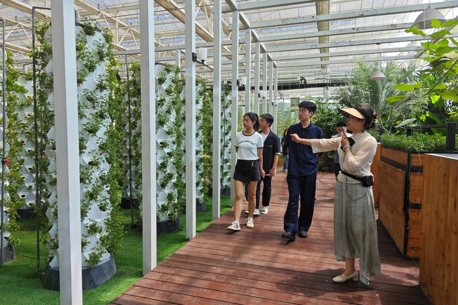 调研最后,卢懿带领实践队员参观了农业科技体验馆。农业科技体验馆以“科技创新引领产业发展,建设农业农村现代化”为主题,集农业科普、研学休闲、农业展示等功能为一体。卢懿表示,何市镇正在探索“旅游+”发展新模式,将传统农耕文化、现代农业园区、生态文旅、研学实践等有机结合,推动“研学游”与“乡村振兴”同频共振,走出一条乡村振兴可持续发展之路。