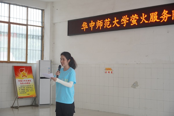 在全体起立、奏唱中华人民共和国国歌后,本次起航大会正式开始。萤火服务队队长甘宇童代表全队进行发言,她从师生两个角度出发,对本次支教活动提出期望。甘宇童指出支教不仅是工作,也是学习,更是锻炼自我、磨炼意志的一次好机会,在活动中展现华师学子的风采。对于本地学生,她希望通过国学、阅读、朗诵、书法等多样的支教课程活动,激发他们的学习热情和创新意识,提升他们的能力水平。