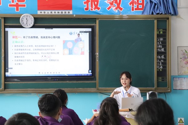 营造教育氛围,加强专业支撑。心理健康教育讲座《今天,你快乐吗?》以全校师生齐唱《幸福拍手歌》开场,实践队三名心理学专业研究生以饱满的热情、专业的心理学视角,围绕“心理健康是什么”“心理疾病知多少”“心理误区有哪些”“我们可以做什么”四个问题面向全校学生以及班主任进行讲解,呼吁学生关注心理健康,提高自身心理素质。实践队员通过蝴蝶拍、正念冥想、安全岛等放松训练教学,帮助学生学会自我调节、缓解心理压力。讲座结束,实践队组织全校学生完成心理健康测评,全面评估学生心理健康状况,营造了关注心理健康的氛围。