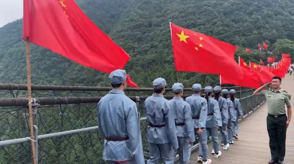 赓续红色血脉,重走长征之路。“耳闻之不如目见之,目见之不如足践之。”队员们身穿红军服走进娄山关战斗遗址,登上长空桥,以古今对话的方式,演绎对革命先辈的崇高敬意,领悟“从头越”的大无畏精神。实践队成员不仅在浮雕前看战旗飘扬,红军战士跃马横枪,前仆后继;还在壁刻前面对党旗,高举右拳,重温入党誓词,“我志愿加入中国共产党……”整齐洪亮,掷地有声。