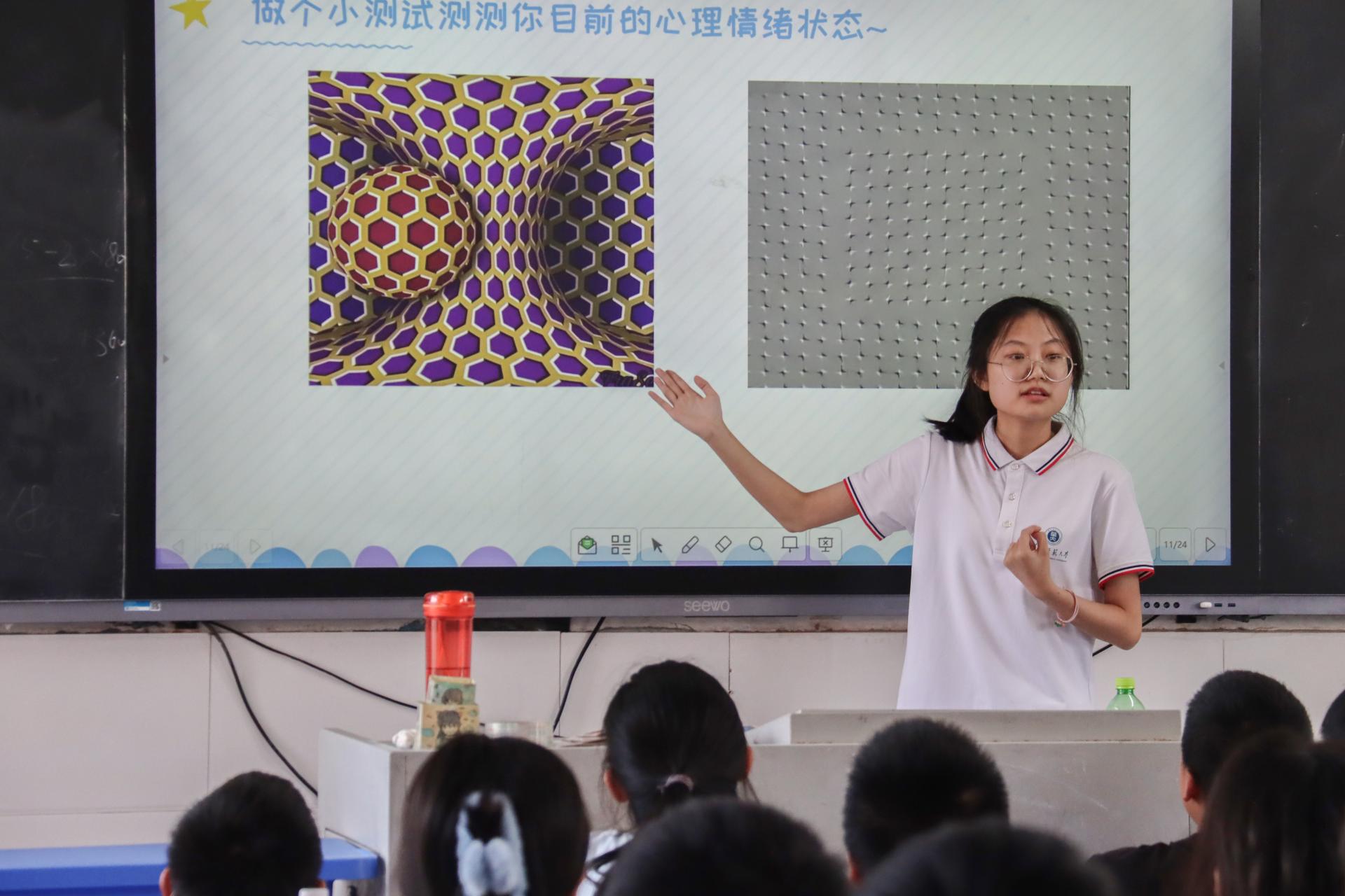 在课程导入部分,丁美存首先用电影《头脑特工队》中的五个卡通情绪角色引导学生思考,同时也引出课程的第一部分——认识情绪,带领学生进入心理课程的学习;随后,她就视频中的几个角色生动形象地讲解了情绪的定义以及五种情绪的特点,并为同学们介绍了正面情绪及反面情绪。为活跃课堂气氛,丁美存还邀请同学上台表演某种情绪,让其余同学来猜测,以此让学生更好地认识不同情绪。