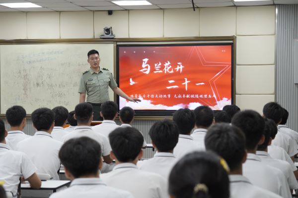 “艰苦奋斗干惊天动地事,无私奉献做隐姓埋名人。”在同学们的热切期待下,退役军人韩浩然分享了《马兰花开二十一》的从军故事。从“四十二小时火车”“我想去戈壁滩上”到“光荣历史英雄部队”,他声情并茂地描述,一幕幕军旅生活场景仿佛浮现在眼前,同学们全神贯注,听到精彩之处,响起阵阵掌声,无不赞叹英雄艰苦奋斗、不怕困难的精神,革命红色种子悄然播种于同学们的心田。