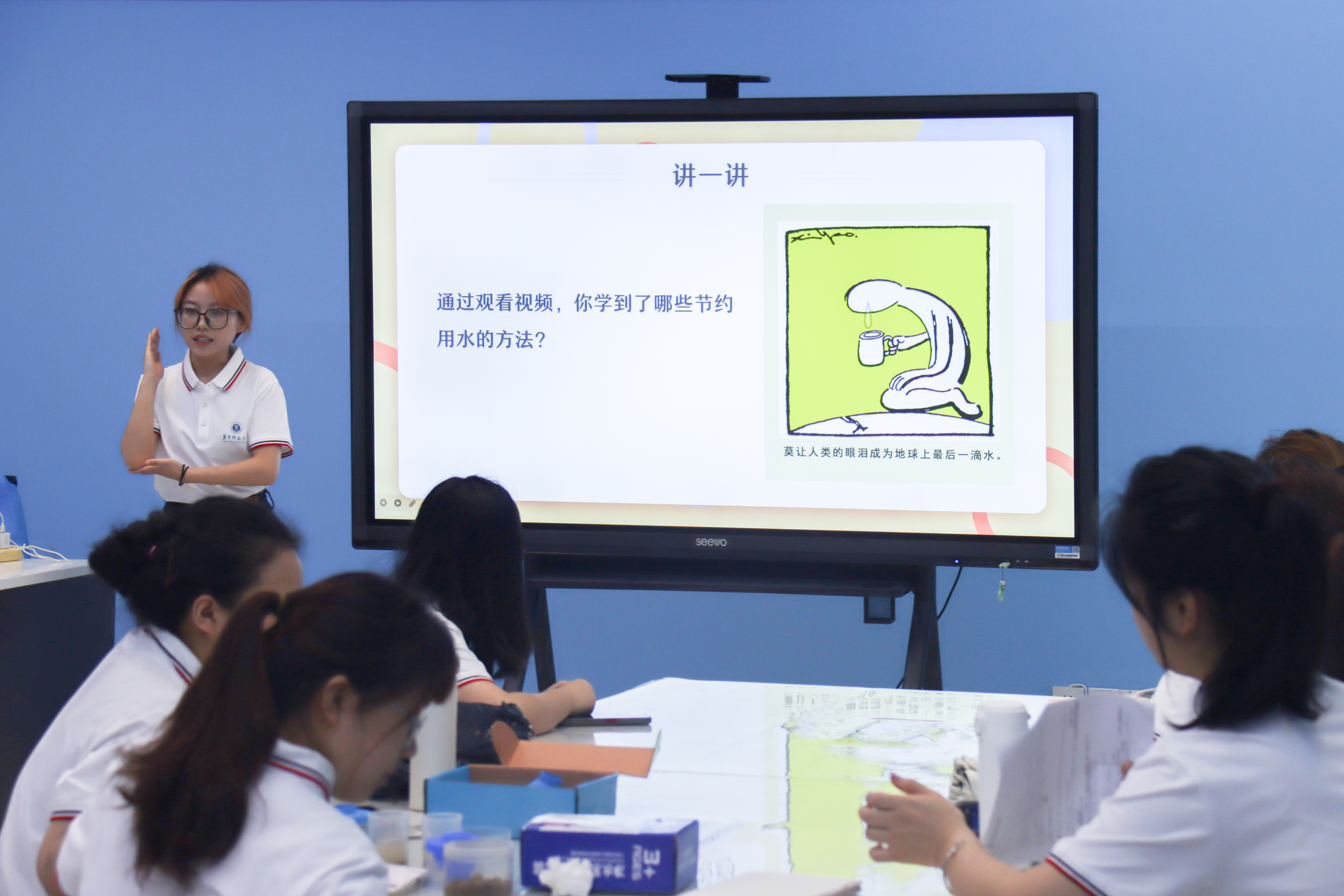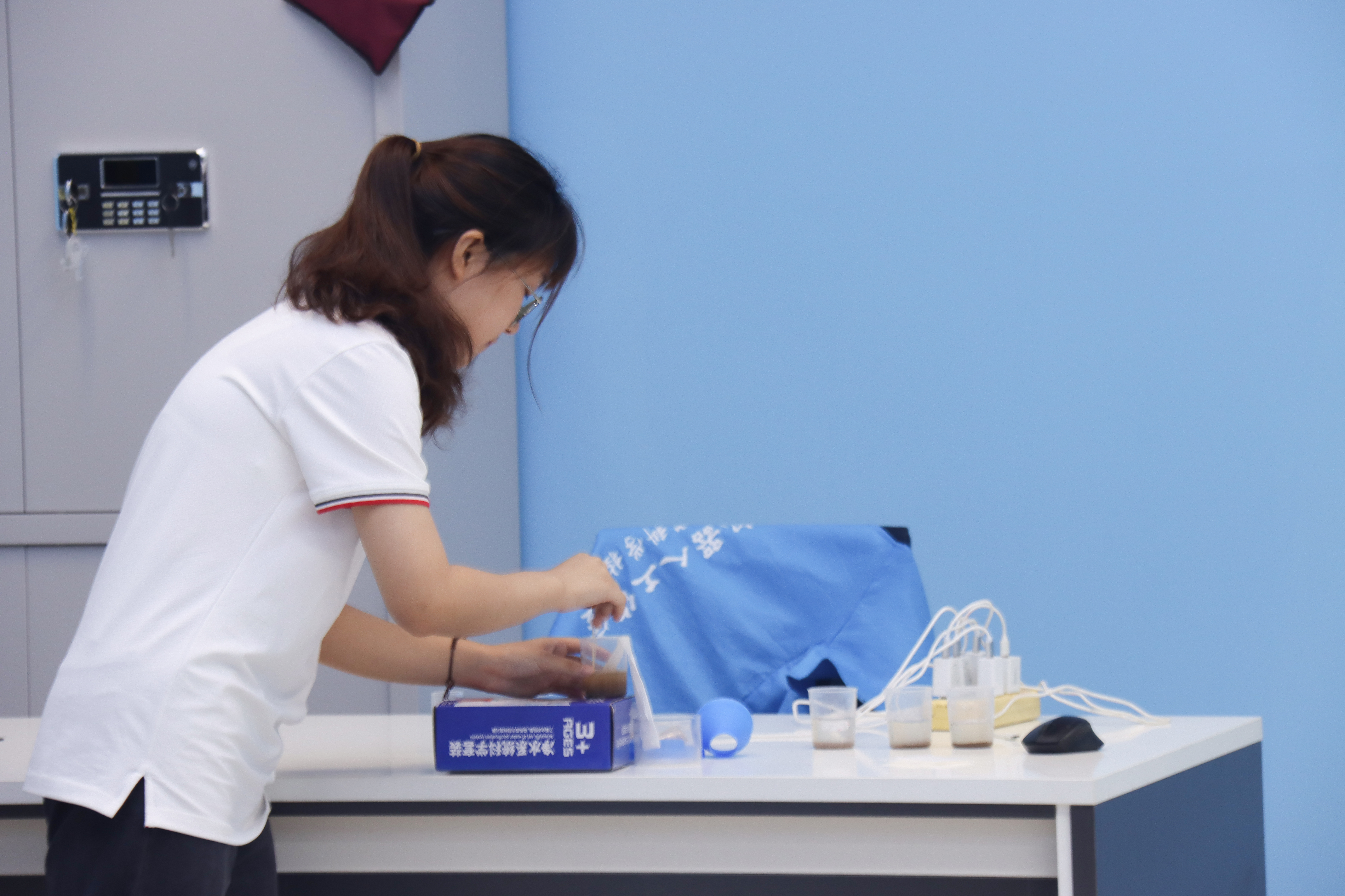 在科技馆老师的暖心鼓励和张安雪同学的带头作用下,实践队其他队员也依次开始无生试讲。王楠鑫与黄鈺婷依次详尽地展开了《污水处理》的两节系列课程,并在现场为大家展示了沉淀、过滤与提纯的实验过程。在课程中,他们充分融入协作学习,采取小组合作的方式,让学生体验污水处理的过程,体悟节约用水的重要性,培养学生严谨踏实的科学态度和动手能力,激发学生的探索欲和好奇心。