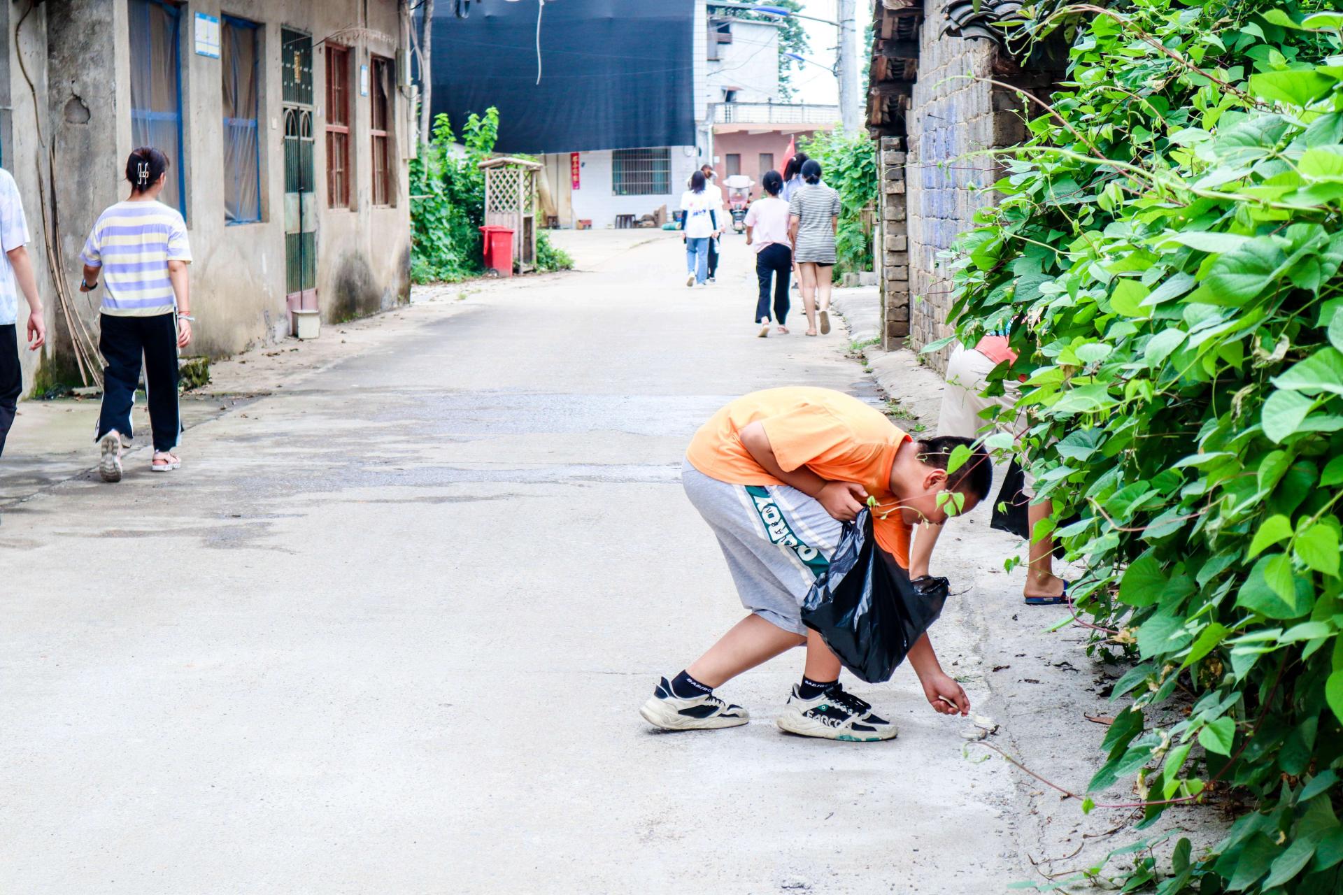 烈日炎炎下,同学们依旧干劲满满。各个队伍沿着水泥路拾捡塑料袋、烟头、塑料水瓶等散落在草丛、石缝里的各类垃圾。红色的横幅、飘扬的党旗和同学们青春洋溢的模样构成了一幅缤纷的清晨乡村风景画。