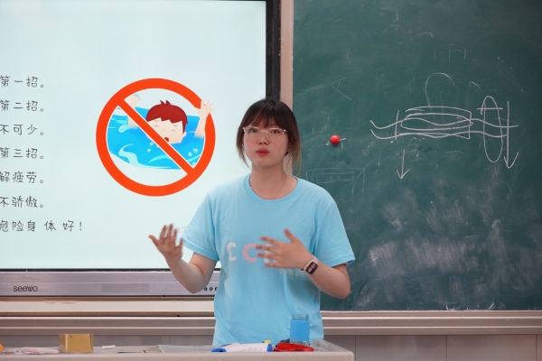 夏季来临,中小学生游泳溺水事故进入高发期。为增强学生假期安全意识,志愿者在全年级开展暑假防溺水主题班会。志愿者以学生身边的龙坝水库为例,引导学生不要去河流、水库等危险水域游泳、戏水,防止意外事故的发生。在“溺水了怎么办”环节中,志愿者以视频的形式向学生展示溺水了如何救人或自救的技能与方法,借助有趣的互动问答、现场实践等多种方式提高学生防溺水的警觉性。最后,志愿者与学生齐读防溺水儿歌,对本次班会进行总结。本次主题班会也在学校营造了浓厚的“防溺水”安全教育氛围。