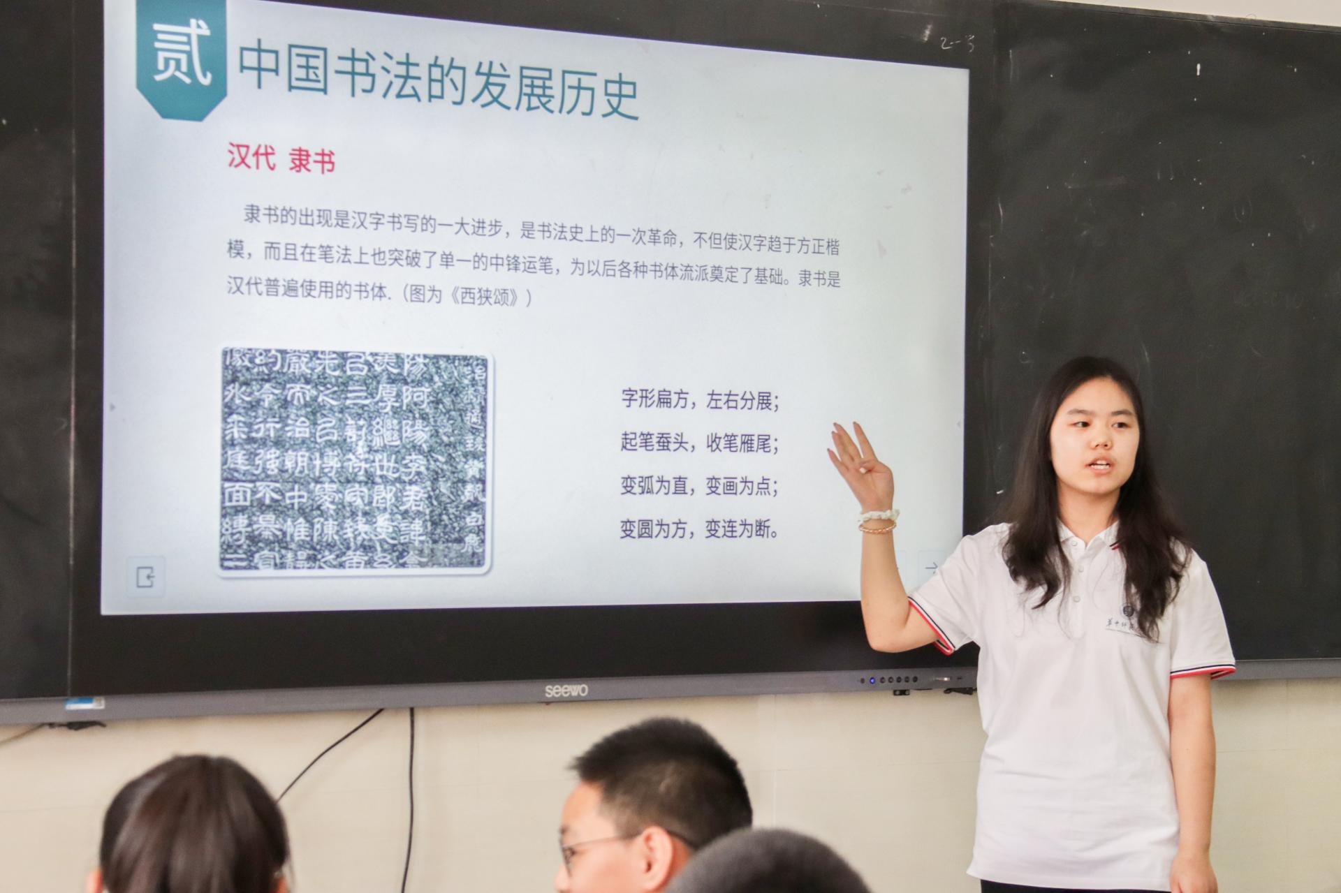 课程伊始,刘俊麟介绍了毛笔在不同时期的不同名称,带领学生们探索书法由来。随后,她通过对书法作品《峄山刻石》《兰亭序》等书法作品的讲授,让学生对书法有了更深刻的理解和更直观的印象。