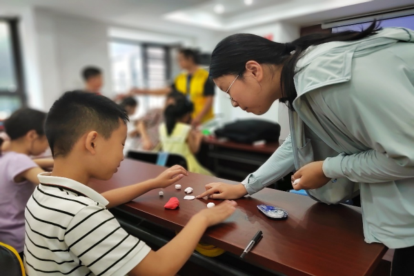 由于每位小朋友的年龄与绘画功底不同,队员们因材施教对其进行不同层次的教学。通过队员们的讲解与指导,小朋友们充分发挥想象力与创造力进行创作,完成一座座生动有趣的黏土作品。最后小朋友与自己亲手制作的楚望台拍照留念。