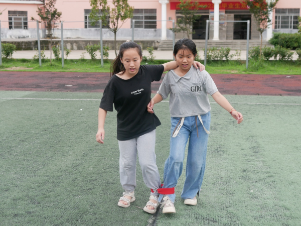 第一个趣味环节是“两人三足”项目。向奕龙向同学们讲解完毕后,每班派出8名学生组成四队进行接力。参赛队员自行将腿绑好,只待一声哨响,参赛队员们迅速出发,迈着稳健的步伐向前方冲去。
