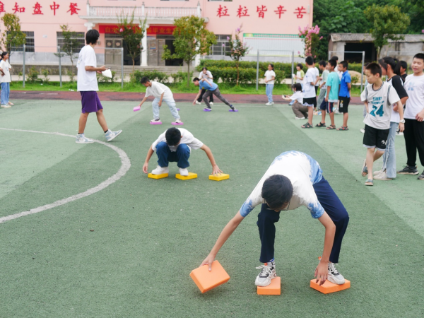 接下来是“摸石过河”环节,此环节中每班派出12人参赛,分成两队,站在规定长度的两端,参赛选手要通过三块板砖前行,由一端出发进行接力,按照所用时间长短进行先后排序。绿茵场上,参赛选手辛勤的汗水在挥洒,支教团成员的关心在传递,班级成员的鼓掌声在回荡。