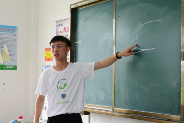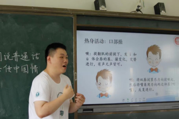 7月17日下午,实践队教研组组员、普通话一级乙等获得者程序开展第一节普通话推广课程。程序在课程的开始设置了挑战环节,通过朗读两段较简单的文本,激发同学们对课堂的参与热情。随后,他为同学们详细介绍了声母的正确发音部位及其具体分类。理论学习结束后,程序因地制宜,结合湖北地区不区分鼻音边音和前后鼻音的方言特点进行讲解。他亲身示范正确发音动作,配合视频讲解,让同学们能够清晰直观地判断普通话发音中音与音之间的不同。