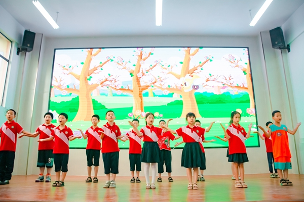 在歌曲《春晓》中,文艺汇演拉开帷幕。舞蹈《小城夏天》以优美的动作、动感的节奏展现夏日的美好与学生的活力。舞台剧《安全上网 健康成长》将网络安全教育融入其中,用诙谐幽默的形式告诉学生:网络世界迷人眼,防止沉迷要践行。二年级学生带来节目《二十四节气歌》,带领观众回顾二十四节气相关常识,在歌曲中感受节气变化。