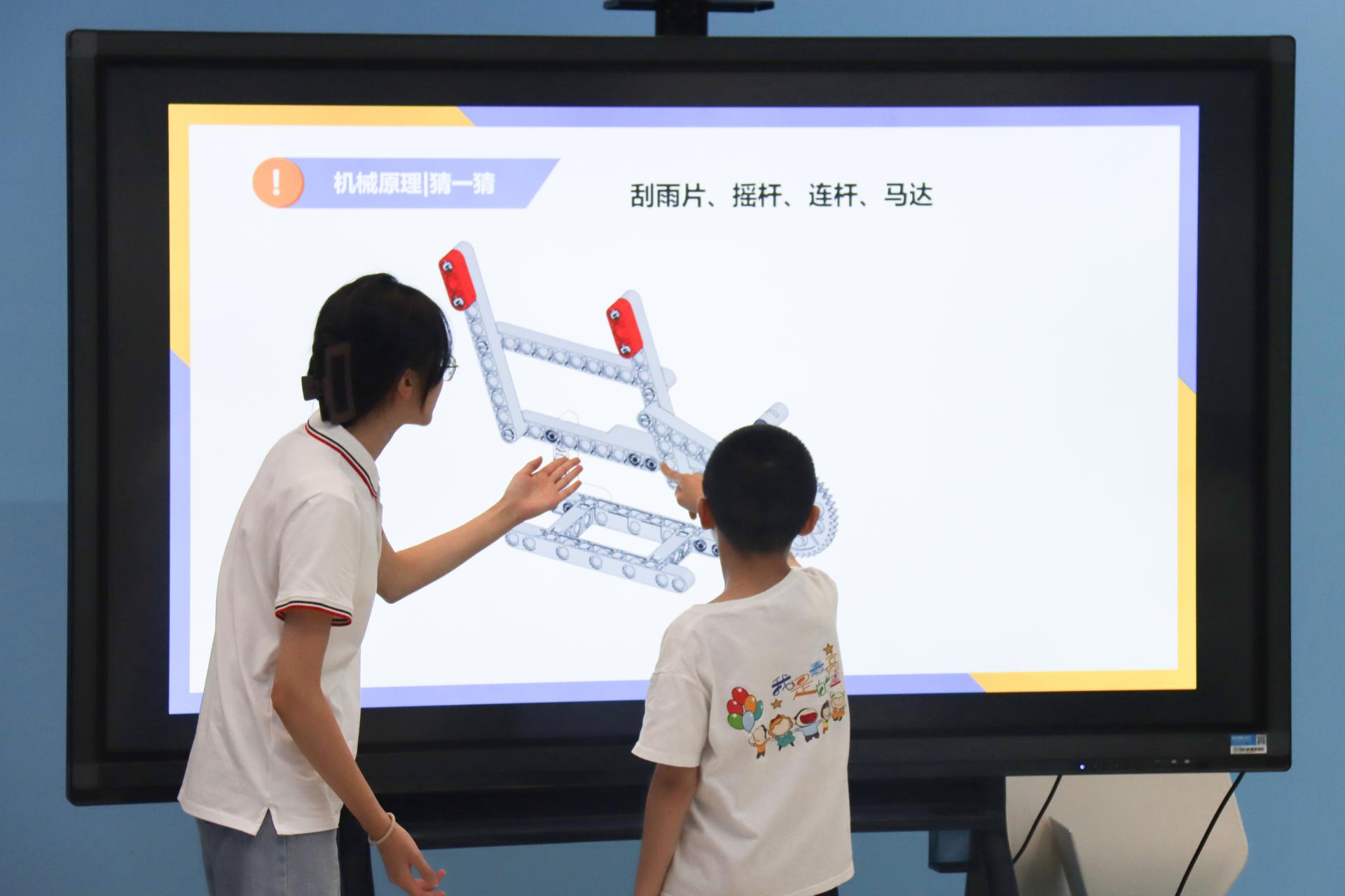 在设计课程时,实践队采取了与科技馆合作的方式,充分利用科技馆的场馆资源,从生活实际出发。实践队成员基于科技馆提供的中鸣捍卫小威奇套装进行课程设计,利用雨刮器这一常见事物引入课题,在讲解中穿插机械结构知识,彰显“机器人+科普”的教学特色。学生在课堂活动中通过拼搭积木来感受曲柄摇杆的结构,深刻理解“四边形具有不稳定性”的公理。