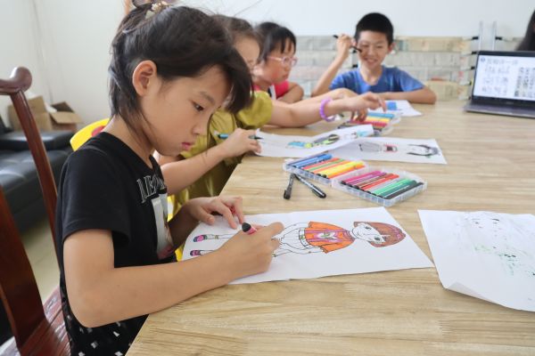 美术素质课上,实践队队员汤益彰手把手带着孩子们画出“难忘的朋友”。汤益彰从漫画人物特征着手,为学生们总结概括出画好人物需要掌握的四个基本元素:五官、发型、形体、神态。在拆分绘画步骤环节,她先从学生们最熟悉的“火柴人”开始尝试,鼓励学生把人物画大画饱满,一时间白色的画纸上充满了千姿百态的“火柴人”。
