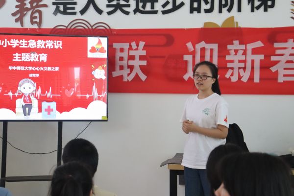 《急救常识》安全课上,实践队队员胡军萍以“为什么学习急救常识”为导入,强调意外伤害发生时4-6分钟为黄金抢救时间。接着,胡军萍分别介绍气道异物梗阻、触电、交通事故、溺水、中暑、烧烫伤等急救知识。