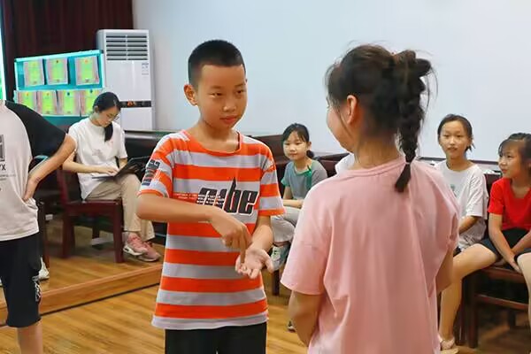 在最后的 “传话筒”游戏中,小组代表用肢体语言描述题目所给的成语或词语,小组成员依次模仿传递,最后一名同学需据此推测出答案。回答正确且用时最短的小组即为游戏的优胜者。学生们在比赛中手脚并用,充分运用自己的想象力与表现力,在竞争中激发了自己的潜能。