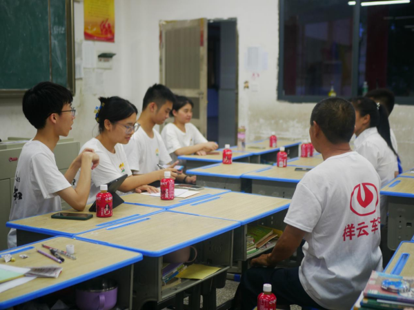 7月26日晚,由于学生小姜(化名)家离学校较远,支教团成员张幸鹏、赵一帆、郑乐怡、郭诗赟、陆凤宇便在小姜家长接学生放学时在教室与其进行了简单的交流。小姜平时成绩较好,学习十分认真,课堂表现也很活跃,受到了老师们的一致喜爱。在谈到小姜平时对历史感兴趣时,赵一帆表示自己平时也热爱历史,并给小姜推荐了不少适合初中生阅读的历史类书籍。随后,调研组成员郑乐怡针对青少年使用手机软件的情况询问了小姜及其家长一些相关问题。在交谈中得知,小姜偶尔会玩游戏、刷视频,但是频率不高。家长表示:“他放学后会先完成作业,我检查之后才会允许他玩一小会手机。有时候我也会用手机搜题,然后讲给他听。”老师们也趁此机会劝诫小姜尽量减少玩手机的时间,可以适当利用手机学习课程、开拓视野等。