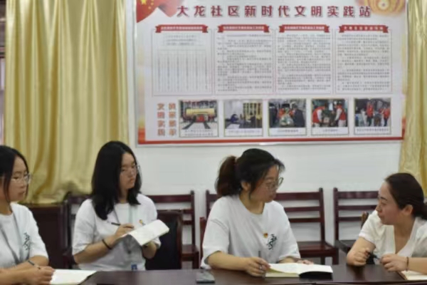 大龙社区党委书记罗莎向实践队成员介绍社区特色的巷道文化和基于此提炼的相亲巷爱工作法。大龙社区处于通道型的地理位置,老年人和流动人口多,辖区内多小巷,居民间交流便利,拥有较浓厚的烟火气息。大龙社区依托巷道,打造特色巷道文化,一方面组建社区居民初心志愿服务队和巷心力邻里服务团队,建设社区珍珠舞蹈队等娱乐文化组织,推动邻里关照;另一方面将小巷作为居民议事阵地,采用小巷议事会新型会议形式,切实听居民之需,解居民之难。