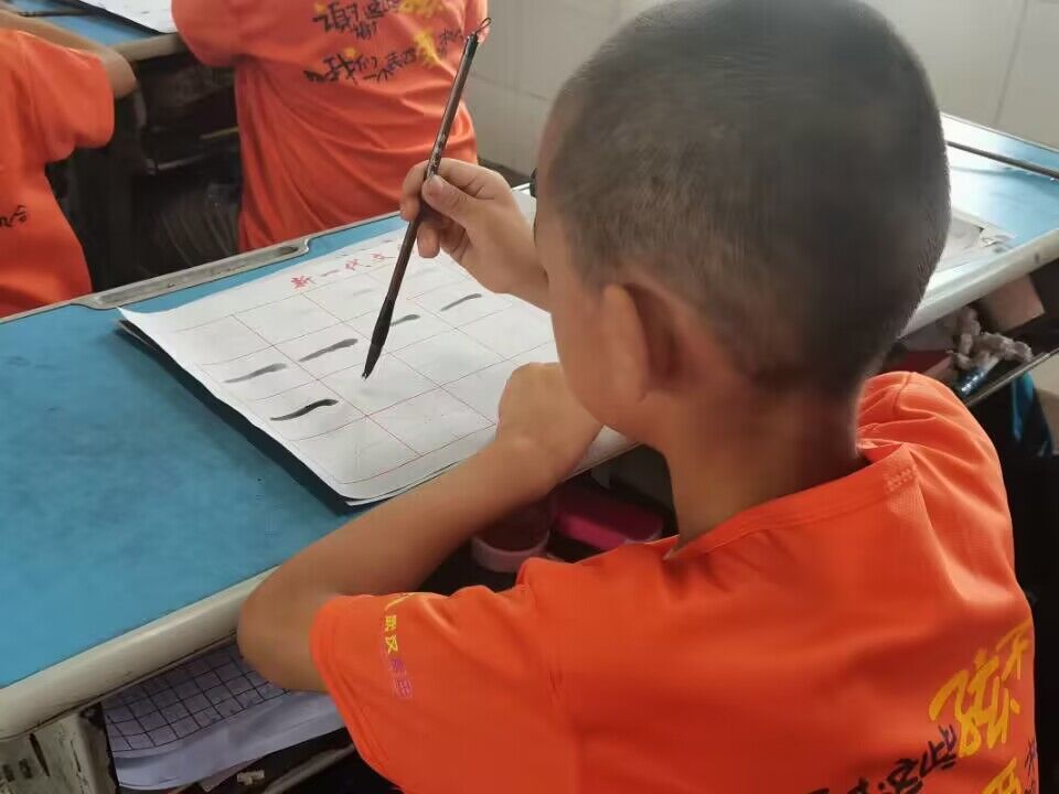 磨浓墨一砚,展宣纸一卷,嗅墨香一袭,寻传统一角。支教队队员姚志锐首先带领同学们复习了毛笔的握笔姿势及横、竖的写法,在复习巩固之后,同学们加深了对知识的理解,强化了对软笔书法的掌握。随后,沿着上一次课程的学习进度,姚志锐以两句口诀“右按逆起、左下滑行、由重到轻、力到锋端”“逆起、右下行、重按、轻出角”介绍了撇捺的写法。最后观看相关笔画教学视频后,姚志锐让同学们自主练习,并逐个纠正同学们的握笔姿势和行笔力度。俯仰中华上下五千年,笔墨纸砚薪火相传,通过这节书法课,同学们领略了书法之美、汉字之神秘,了解了中国灿烂如星河的宝贵文化财富。